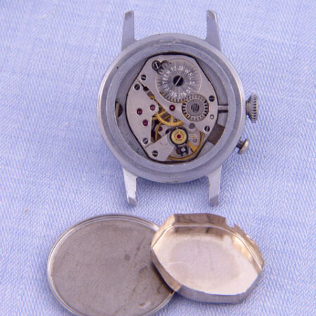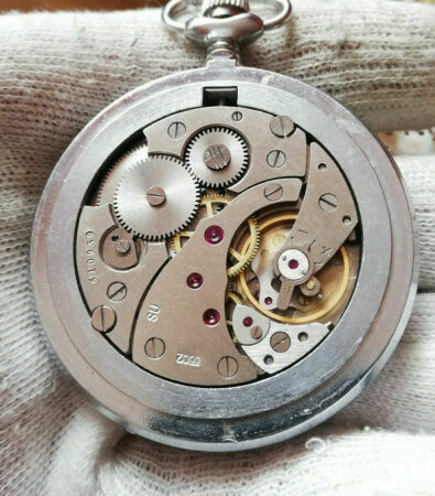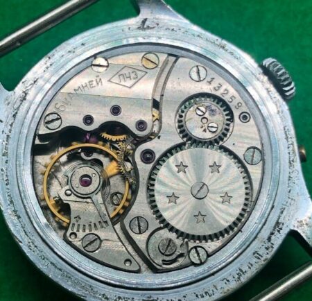 Ces montres étaient animées par le mécanisme 2601 (en savoir plus sur ce mécanisme), qui dérivait du célèbre Pobeda mais qui était dépourvu de seconde. L’utilité d’une trotteuse n’était pas assez grande pour contrebalancer le risque d’endommager le fragile pignon des secondes lorsqu’on le touchait. De plus, un pignon de canon solide augmentait probablement l’intégrité structurelle générale de la montre. Les aiguilles étaient aussi épaisses et robustes pour résister au contact régulier avec les doigts.