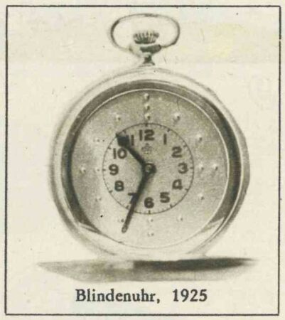 Les armes chimiques et les explosions d’obus ont laissé de nombreux soldats aveugles lors de la première guerre mondiale. C’est sans doute pourquoi la société horlogère allemande Thiel (prédécesseur de Ruhla) a commencé la production de montres braille.
