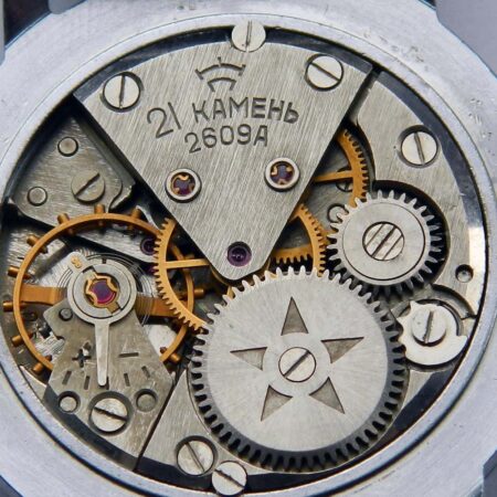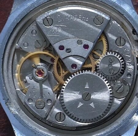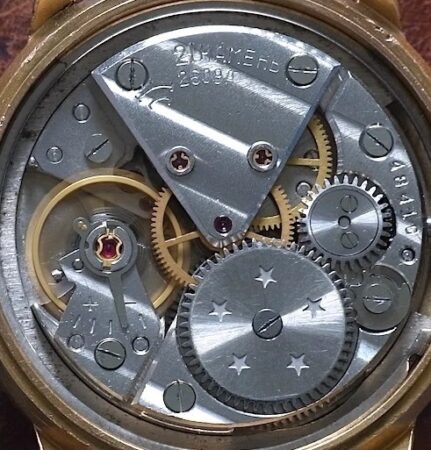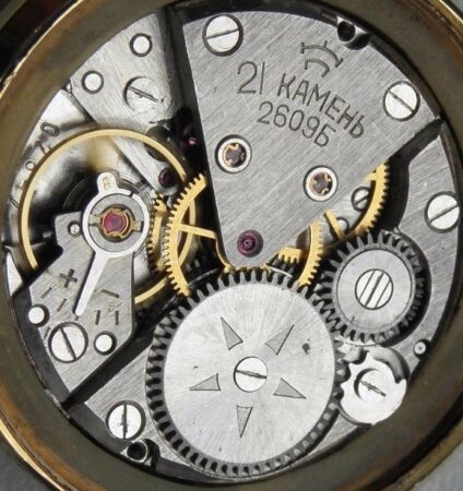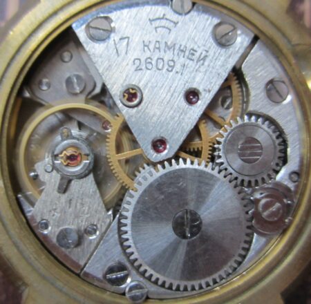 C’est le seul mécanisme soviétique connu une finition guillochée (mais l’essentiel de la production est faite avec la finition classique.