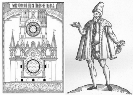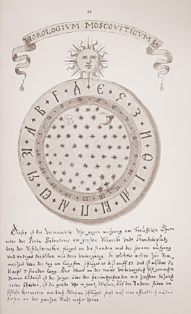 Au XVIIIe siècle, le cadran qui pesait plus de 400 kilos était constitué de planches enduites de peinture bleu ciel. La durée du jour étant maximale en été, il était divisé en 17 secteurs et les heures étaient marquées par les majuscules de l’alphabet slave. Sur le pourtour, l’horloge est ornée d’étoiles d’or et d’argent, ainsi que d’un soleil et d’une lune. L’aiguille des heures est absente : son rôle est tenu par une image du soleil doté d’un long rayon. Tous les seize jours, le rapport des heures de jour et de nuit changeait et il était nécessaire de réajuster le mécanisme. Son système de fonctionnement était particulier car ce n’est pas le rayon-aiguille qui tournait, mais le cadran.