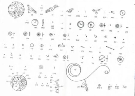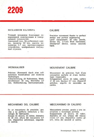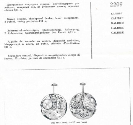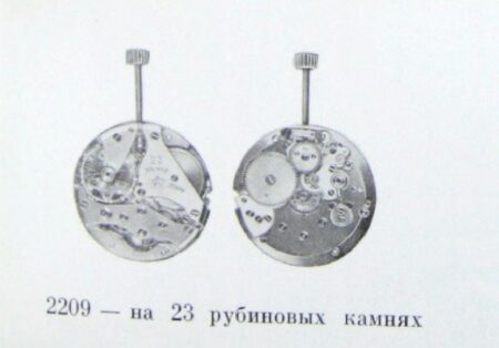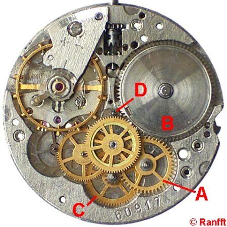 C’était un mouvement de conception très inhabituelle, avec une roue intermédiaire A entre le barillet B et la roue des minutes C le rouage complet est déplacé vers la périphérie. Et en raison de l’entraînement indirect de la roue des secondes D, il n’y a pas non plus de roue des secondes au centre. Ni le balancier ni le barillet ne sont chevauchés par une roue, ce qui permet, au prix d’une relative complexité et d’une difficulté d’assemblage, un gain de hauteur sans réduction de la robustesse ou la précision. Le Poljot 2209, à peine 11% plus haut, était nettement plus simple et moins cher: il a débouché sur une production massive tandis que celle du Raketa 2209 (et son évolution, le 2209H) a vite été abandonnée après environ 100.000 exemplaires produits. Il reste le mouvement soviétique à trois aiguilles le plus fin jamais produit.