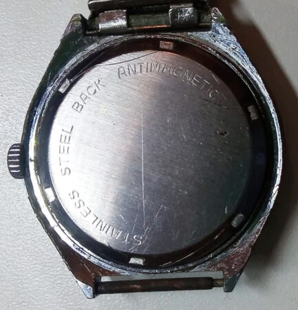 Gravure sur le fond : en cercle : stainless steel back – antimagnetic