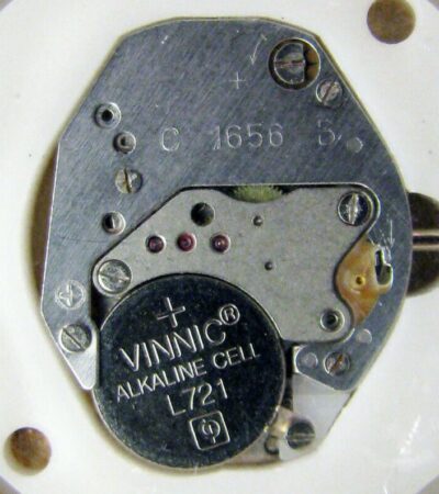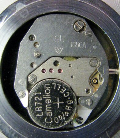 Mécanisme à quartz à affichage analogique de la Fabrique de Montres d’Ouglitch.Le 1656A est une version améliorée.Produit sinon dès la fin des années ’80, du moins dès le début des années ’90Longueur: 16mm