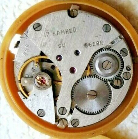 Mouvement mécanique avec jour et date de la Fabrique de Montres d’OuglitchCe mécanisme est sinon l’exacte copie de 2628H conçu par la 1ère Fabrique de Montres de Moscou, du moins basé sur lui.17 rubisProduit dans les années ’80.