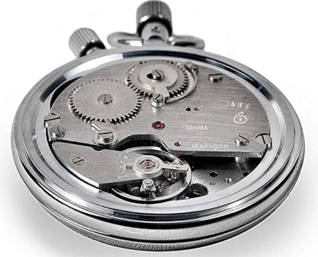 Dernière version de la famille du mécanisme de chronomètre à rattrapante 4295 de la Fabrique de Montres de Zlatoust, le 42608A a un balancier en nickel mais n’a pas de pont d’échappement séparé.