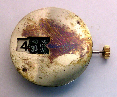 La finition de cet exemplaire est très soignée. Le cadran était bleu à l’origine mais il a tourné au brun avec le temps. L’absence d’inscription ou de marquage laisse penser qu’il s’agit d’une pièce expérimentale.