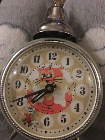 Réveil Yantar de la Fabrique de Montres d’Orel avec motif le chat Léopold et une des souris hooligan.
