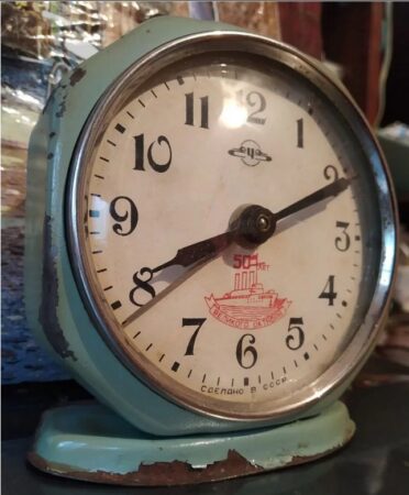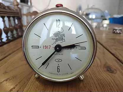 Réveil Vitiaz fabriqué en 1967 par la Fabrique de Montres de Rostov célébrant les 50 ans de la Révolution d’Octobre en mettant en avant le croiseur Aurore.