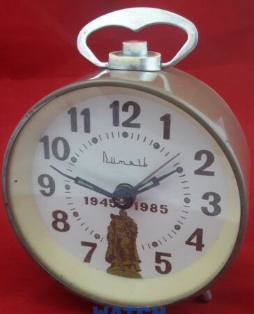 Réveil Vitiaz fabriqué en 1967 par la Fabrique de Montres de Rostov célébrant les 50 ans de la Révolution d’Octobre en mettant en avant un cavalier rouge.