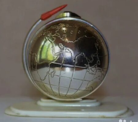 Deux modèles de réveil Slava célébrant la conquête spatiale. Un couvercle en forme de planisphère est au dos.