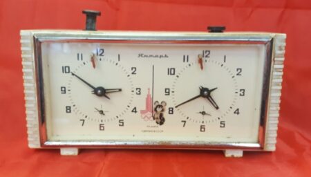 Horloge d’échecs Yantar avec le logo et la masquotte des Jeux Olympiques de Moscou de 1980.