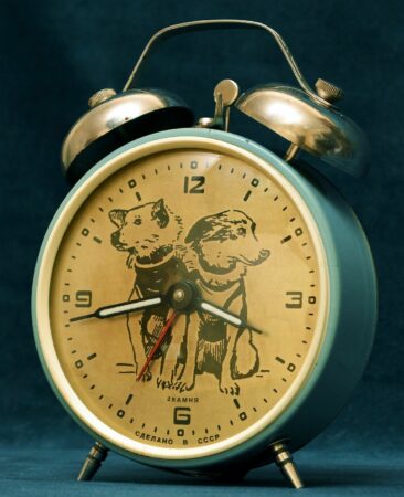 Réveil-matin de la Fabrique d’Horloges d’Orel célébrant le vol orbital en 1960 des chiennes Strelka et Belka. Ce cadran a été placé dans plusieurs modèles de réveil, mais plusieurs autre cadran figurant Strelka et Belka sont des faux.