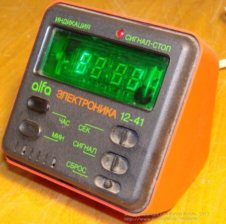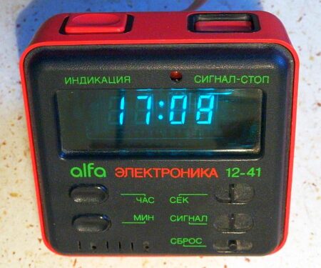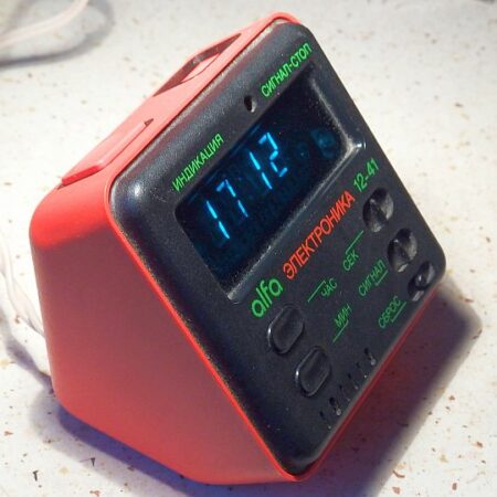Réveil électronique produit par la Fabrique « Alpha » de Riga à partir de 1989.Les fonctions sont heures/minutes/secondes + alarme.
