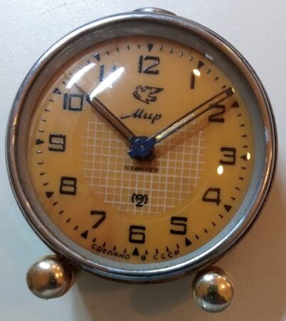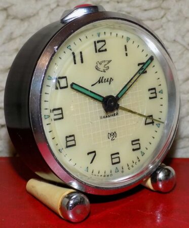 Les réveils « Mir » auront été produits avec des variations d’aiguilles, de socle (voir ici) et de cadran (voir ici). Ce modèle avec un quadrillage sur le cadran est assez tardif (voir un réveil Mir de la première génération).