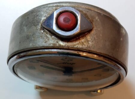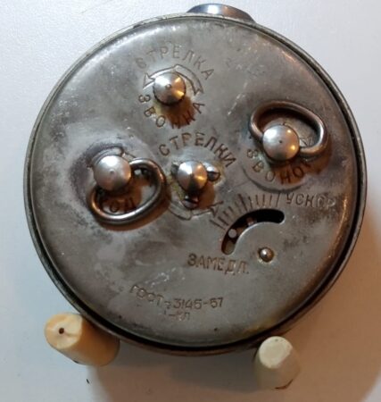Ce réveil est équipé du mécanisme de réveil-matin 61M à 11 rubis (5671 dans la nouvelle nomenclature) a été produit des années ’50 jusqu’après la fin de l’URSS dans des quantité astronomiques (plus de 100 millions d’exemplaires!).