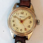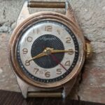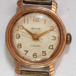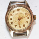 Les Aurora (Аврора), qui avaient de beaux cadrans, très soignés, généralement dans des boitiers d’aluminium doré (et plus rarement dans des boitiers de laiton chromé). Elles emboîtaient le mécanisme 154ЧН (Аurora veut dire « Aurore », mais c’était aussi le nom du croiseur qui a donné le signal de la Révolution d’Octobre (voir ici)