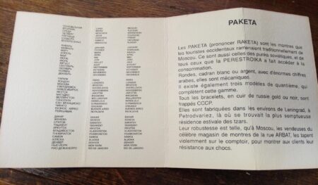 Cette montre a été acheté à Montpellier. Le distributeur était la société E.F.A. qui avait fait produire un packaging propre vantant les montres… Raketa (le mode d’emploi associé était celui de la Raketa « calendrier perpétuel »).