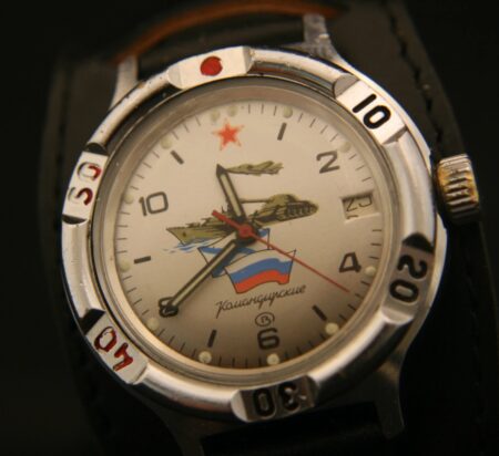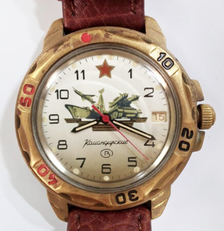 Montre bracelet, mécanique, à simple tantième, étanche, de type et de marque Komandirskie, produit par la Fabrique de Montre de Tchistopol.