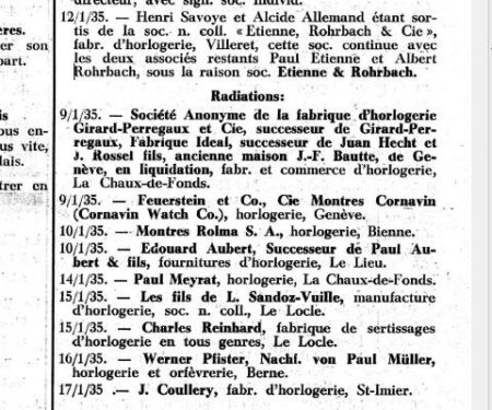 En 1935, Cornavin Watch Co. ferme ses portes pour cause de faillite.