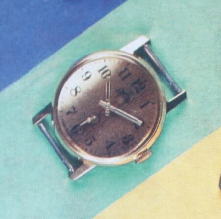 Le catalogue montre un jeu d’aiguille différent, mais les éléments (boitiers, cadrans, aiguilles) s’entre-combinaient beaucoup chez ZIM. Et pour un pareil cadran, ce sont les aiguilles « bâtons » que l’on retrouve le plus souvent: