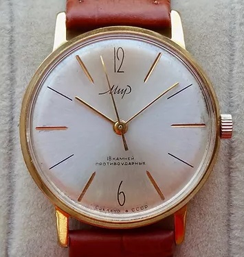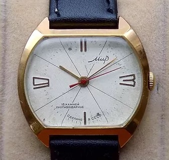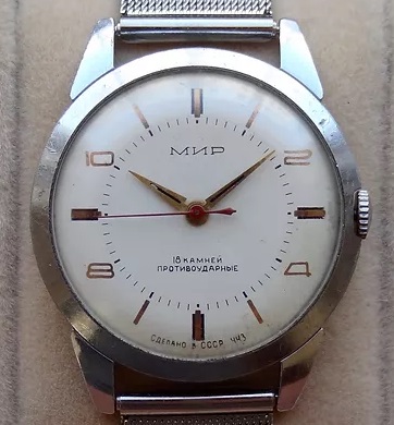 La marque Mir (Мир, qui signifie « monde » ou « paix ») a été introduite en 1960 par la Fabrique de Montres de Tchistopol. Ce montres emboîtaient le calibre 2209 à 18 rubis, qui allait être produit à des millions d’exemplaires tant pour des montres habillées que pour des montres de plongée. Quelques Mir, plus rares, emboîtent un calibre 2214 (avec date).