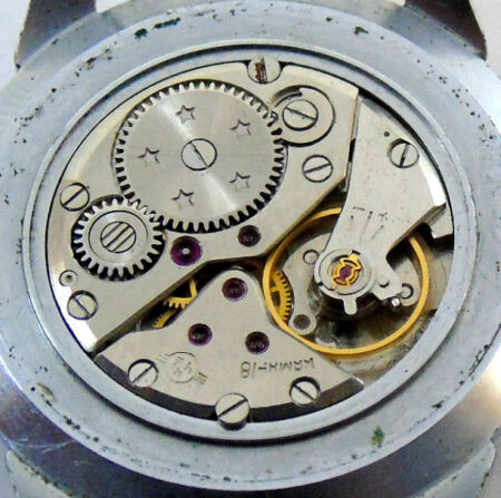 Mentions sur le calibre : N° de série (72254) sur la platine, logo de l’usine et камней 18 sur le pont, cinq étoiles sur le rochet.