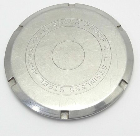 Fond à bague gravé « antimagnetic shockproof – dustproof – all stainless steel »