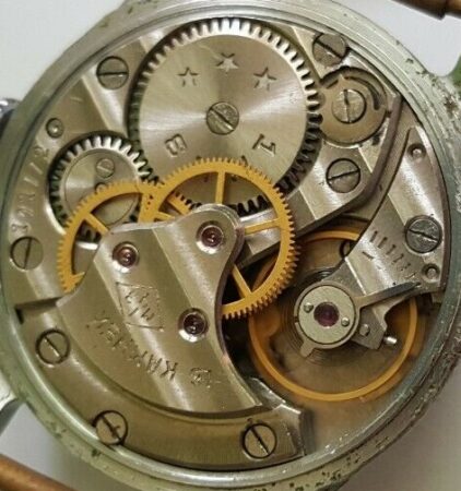 Mentions sur le calibre : n° de série (197**72) et 2-56 (2e trimestre 1956) sur un pont, logo de l’usine (initiales 1MЧЗ dans un losange) et 16 камней (16 rubis) sur un autre, cinq étoiles sur le rochet. Cotes de Genève.