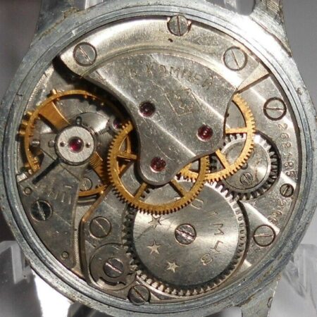 Mentions sur le calibre : n° de série (268185) et 2-56 (2e trimestre 1956) sur un pont, logo de l’usine (initiales 1MЧЗ dans un losange) et 16 камней (16 rubis) sur un autre, cinq étoiles sur le rochet. Cotes de Genève.