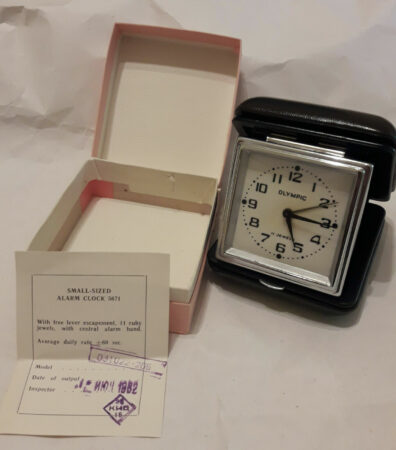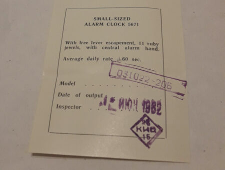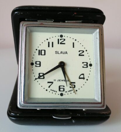 C’est en fait le classique réveil de voyage Slava 031022 (voir ici), de la fin des années ’50 (alors sous la marque Dorojnii) jusqu’à la fin de l’URSS.