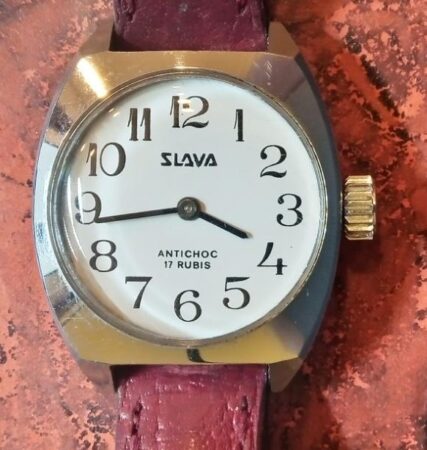 Montre bracelet pour dame fabriquée en France par la Société anonyme Slava (Besançon) avec un calibre de la Fabrique de montres d’Ouglitch