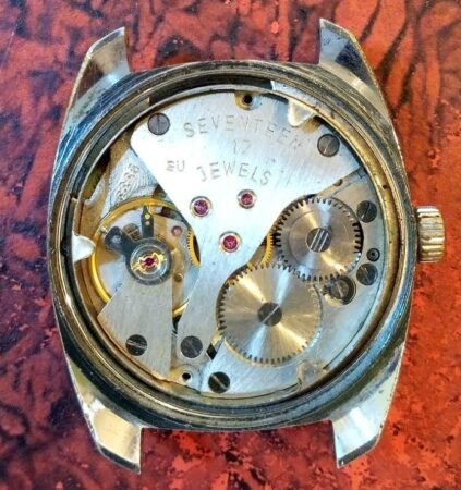 Autre mention sur le calibre : SEVENTEEN 18 JEWELS et SU sur un pont, n° de série sur la platine