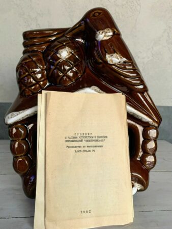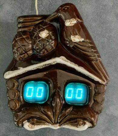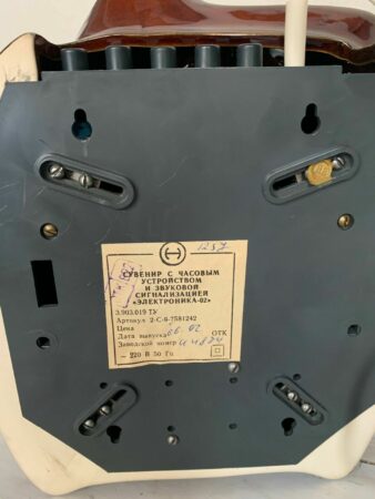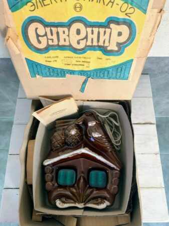 Ce modèle a été produits de 1984 à 1993 au combinat Hadron de Novossibirsk sous la marque Elektronika01.ette horloge digitale à affichage en tubes a un boîtier en céramique émaillée représente une cabane avec un lys surmonté d’un coucou et de pignons de pin. Elle a été produite par le combinat Hadron de Novossibirsk sous la marque Elektronika 02. Elle est équipée de microcircuit spécial KR145IK1901, offrant une précision supérieure à celle des montres à quartz. Cet exemplaire particulier a été produit en 1991.