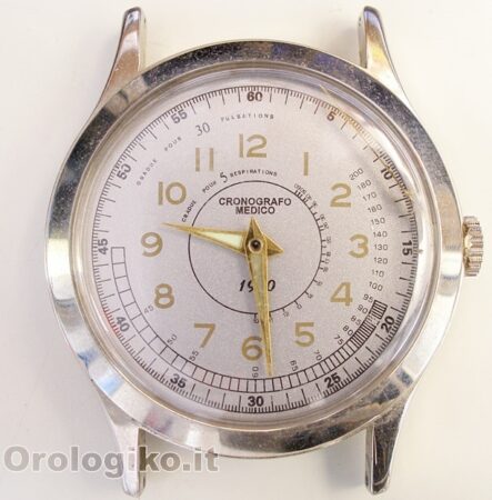 Ce « Cronografico medico » n’a rien d’un chronographe médical. C’est une montre faisant partie d’une série de quatre dont les cadrans évoquent les générations successives de chronographes médicaux. C’est pour cela qu’ils portent aussi la mention 1910, 1920, 1940 et 1960.