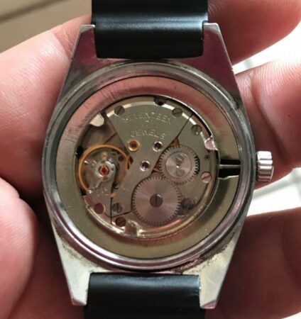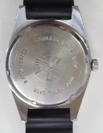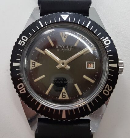 Plongeuse « Trois atmosphères » (ce qui n’est rien du tout : cette « plongeuse » résisterait à peine à une trempette dans un ruisseau) emboîtant un Poljot 2414 (la trotteuse manque sur cet exemplaire).