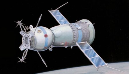 Le motif est un vaisseau Soyouz stylisé
