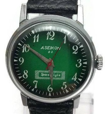 Aseikon est une marque de Hong Kong qui emboîtait dans les années ’70 et ’80 presque essentiellement des mouvements est-allemands Ruhla (parfois sans marquage, parfois marqué de l’importateur de Hong Kong). Aseikon a aussi emboité des calibre à quartz japonais.