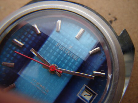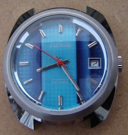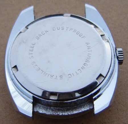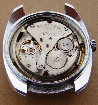 Cette société a emboité des mécanismes de diverses origines, souvent des Jeambrun PS32C, mais aussi, comme pour ce modèle des Poljot 2614.2H de la 1ère Fabrique de Montres de Moscou