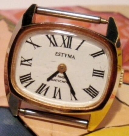Estyma a aussi commercialisé des montre-bracelets emboitant des mécanismes soviétiques, comme cette montre de dame emboîtant un Tchaïka 1301 de la Fabrique de Montres d’Ouglitch.
