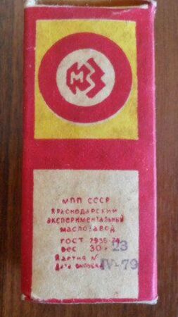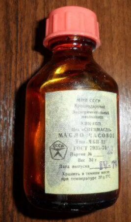 Ci-dessous: un flacon de 30gr (les Russes mesurent les huiles et alcools au poids) d’huile MBP, produit en 1979 par la fabrique de Krasnodar (photos: avito)