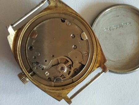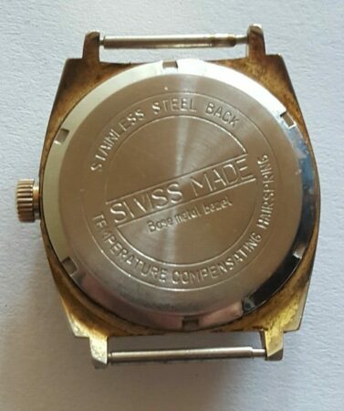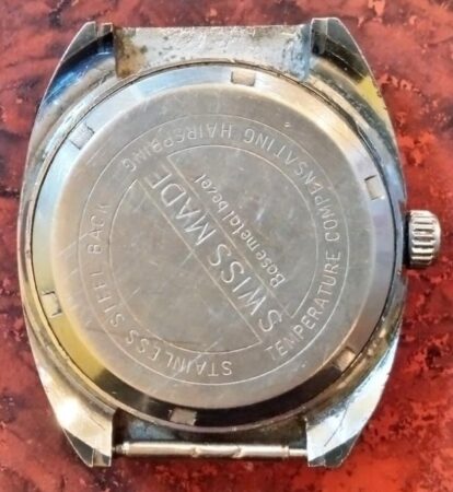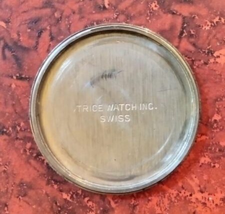 Boîtier de laiton chromé au fond gravé : base metal bezel – swiss made – stainless steel back – temperature compensating hairspring [et à l’intérieur:] Trice watch inc swiss