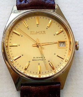 Cette Elmar fabriquée à Hong Kong emboîte un mouvement 2214 de la Fabrique de Montres de Tchistopol. Les cadrans étant adaptés à différents types de mécanismes, il n’est pas étonnant d’y voir mentionné « 21 rubis » alors que le Vostok 2214 en compte 18.