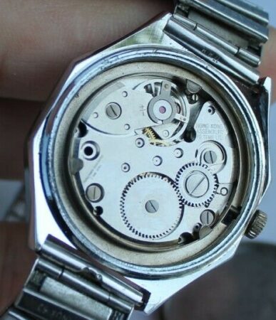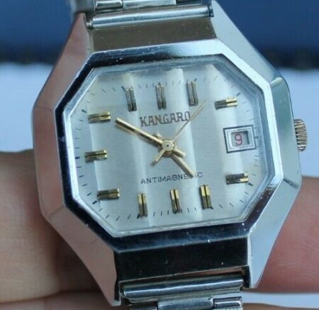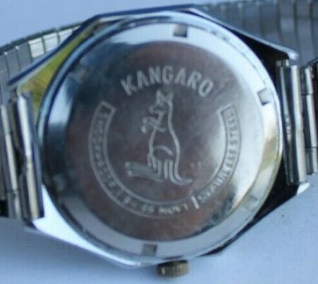 Cette Kangaro fabriquée à Hong Kong emboîte un mouvement 2214 de la Fabrique de Montres de Tchistopol. Les cadrans étant adaptés à différents types de mécanismes, il n’est pas étonnant d’y voir mentionné « 21 rubis » alors que le Vostok 2214 en compte 18.
