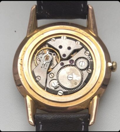 La montre a été à l’étranger. Le boîtier provient également de Tchistopol, mais le plaquage a été appliquée sur le lieu d’assemblage (il est en or rose, ce que ne faisaient pas alors les Soviétiques). Les aiguilles, et peut-être le cadran, venaient également d’URSS.