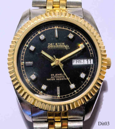 Montre-bracelet automatique de marque Paladin.Elle emboite un calibre 2427 de la 2e Fabrique de Montres de Moscou.Fabriquée à Hong-Kong (voir ici).