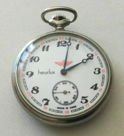 Montre de poche (type « savonnette ») de marque Heurlux produite par la Fabrique de Montres de Tcheliabinsk.