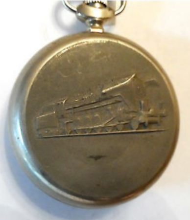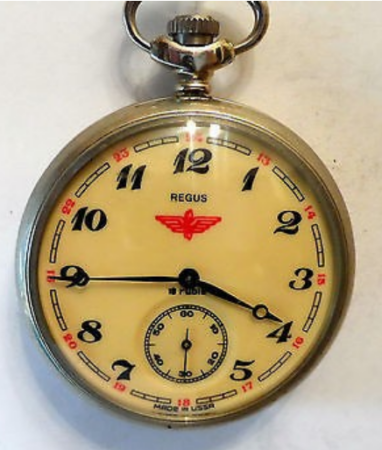 Montre de poche (type « savonnette ») de marque Regus (une marque sous laquelle était généralement commercialisée des montres suisses), produite par la Fabrique de Montres de Tcheliabinsk.