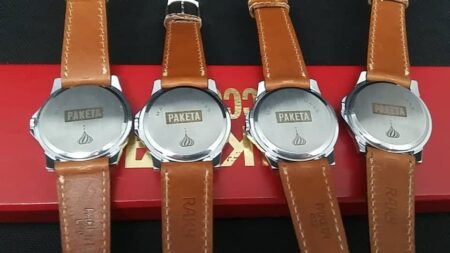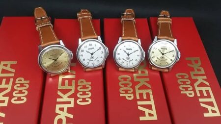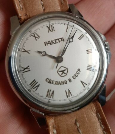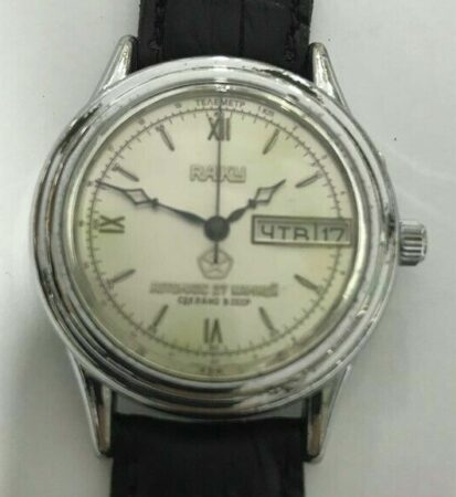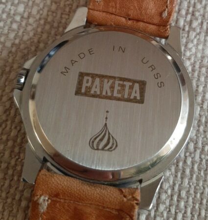 Cette Raketa est en fait une Raky, une montre destinée au marché italien et très vraisemblablement produite en Italie: même facture, même erreur dans le logo de la marque de qualité de l’URSS.