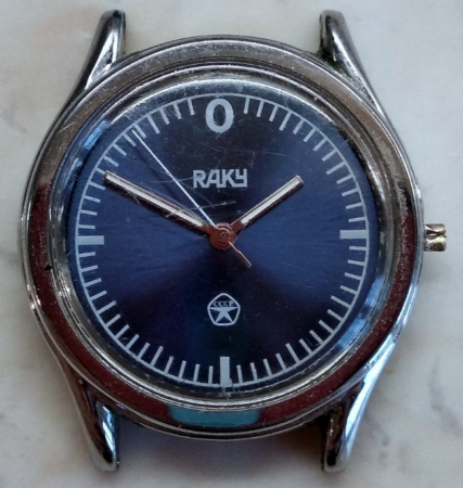 Les Raky sont des montres destinées au marché italien et très vraisemblablement produites en Italie. Celle-ci emboite un mouvement à quartz 2256 de la Fabrique de Montres d’Ouglitch.