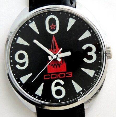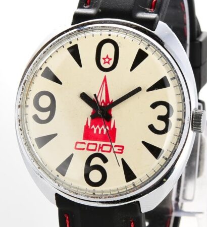 Cette montre-bracelet de marque Soyouz emboîte un calibre 2609.HA de la Fabrique de Montres de Petrodvorets. Le cadran associe la tour Spasskayya du Kremlin et l’index Raketa « big zéro »